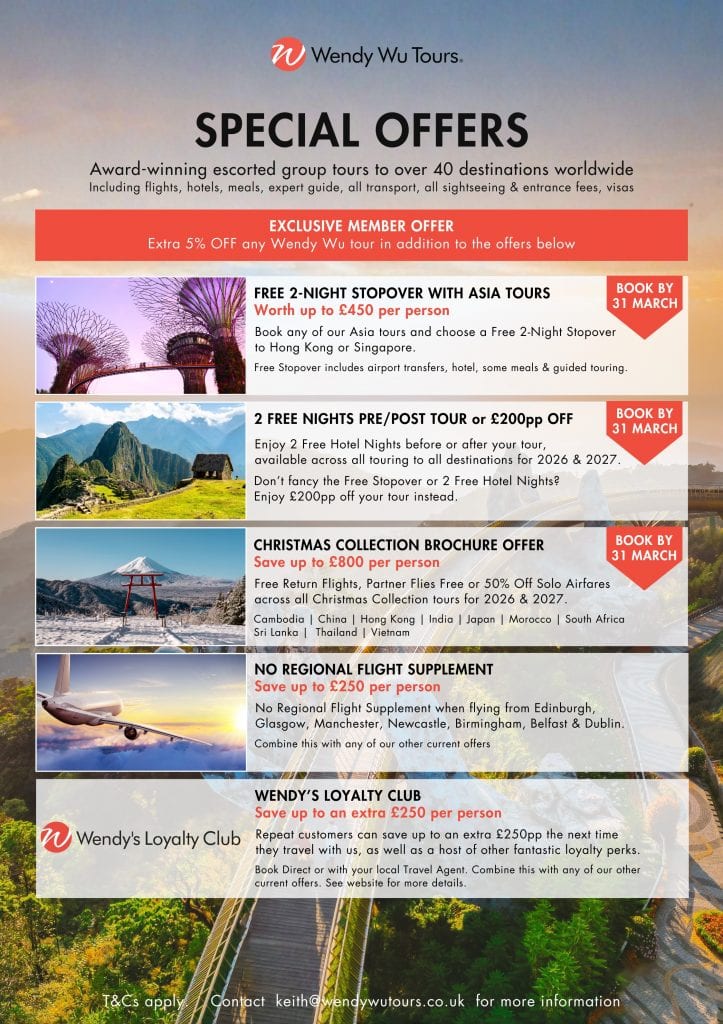 Our partner Wendy Wu tours – the UK’s leading Asia specialist and winner of ‘Best Specialist Tour Operator Award’ for 15 years has some incredible offers for our members this month.