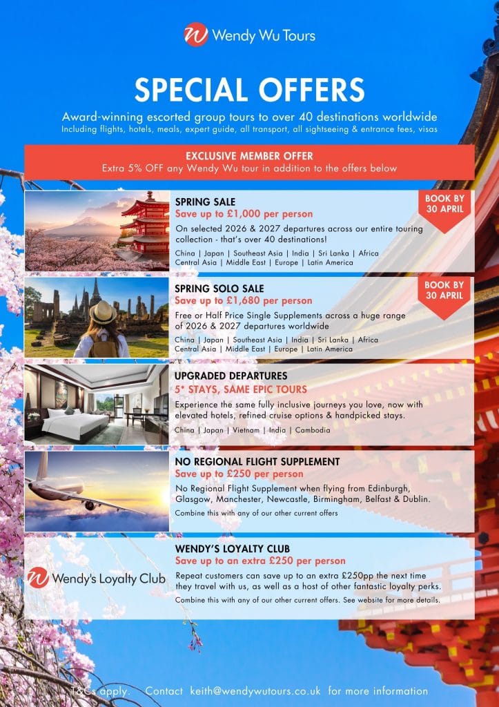 Our partner Wendy Wu tours – the UK’s leading Asia specialist and winner of ‘Best Specialist Tour Operator Award’ for 15 years has some incredible offers for our members this month.